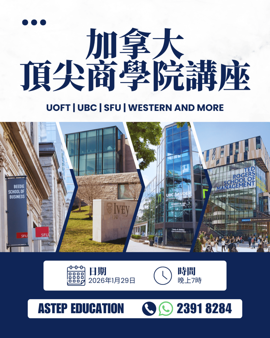 Astep Education 將於 2026年1月29日(星期四)晚上7時 舉辦《加拿大大學商學院》免費線上講座。